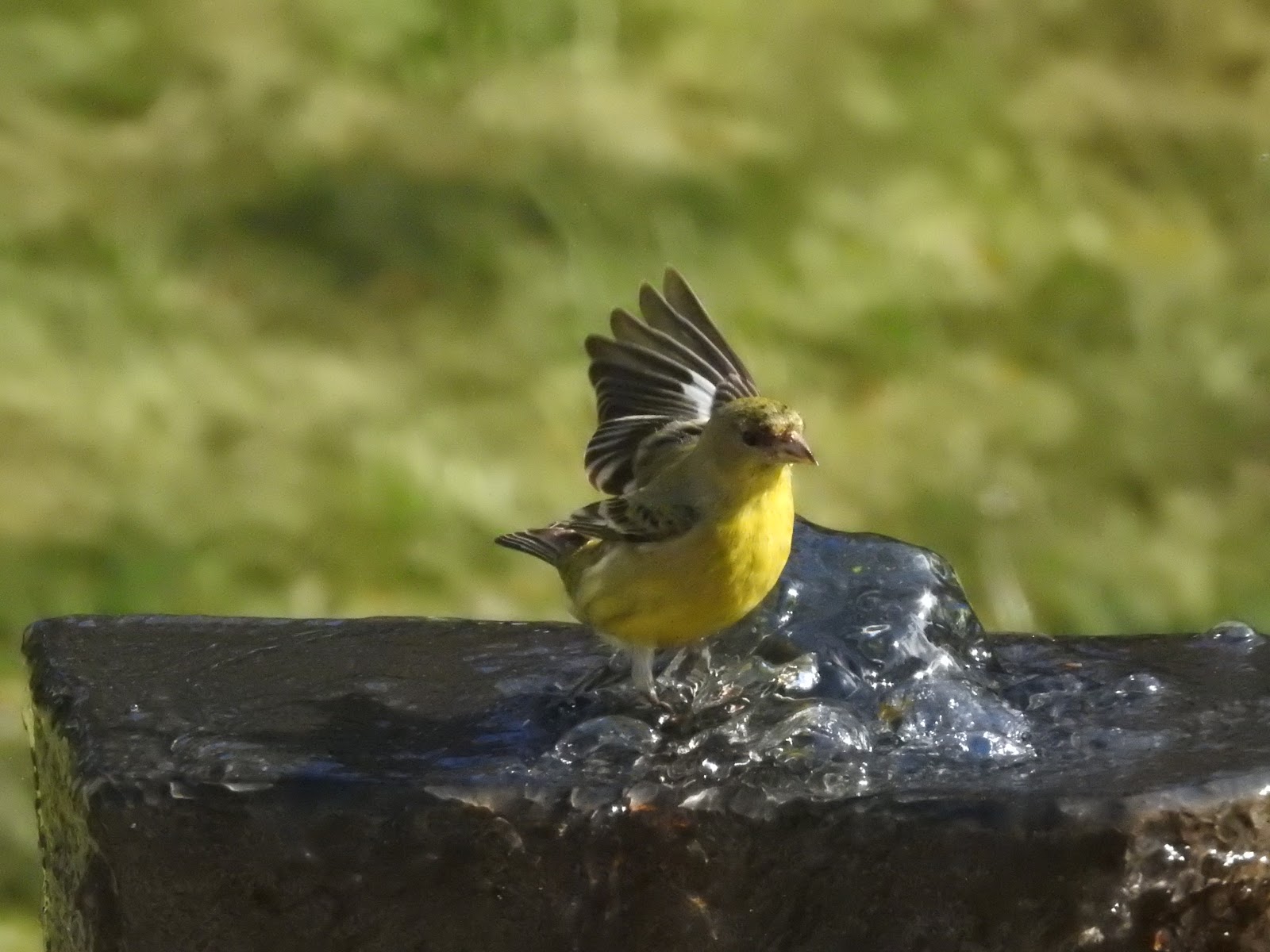 A flash of yellow caught my eye, and I saw a goldfinch on top of the fountain. This was surprising because I thought the flowing water would make it difficult for a small bird to find purchase on the stone's polished surface. The bird splashed around a bit, then flew off to the blooming cherry tree and came back with a friend. They proceeded to take a bath. The whole scene was what I would have called "Terminally Cute" in my Reed College days, and what Mark and I usually call "Oogie-Boo!"